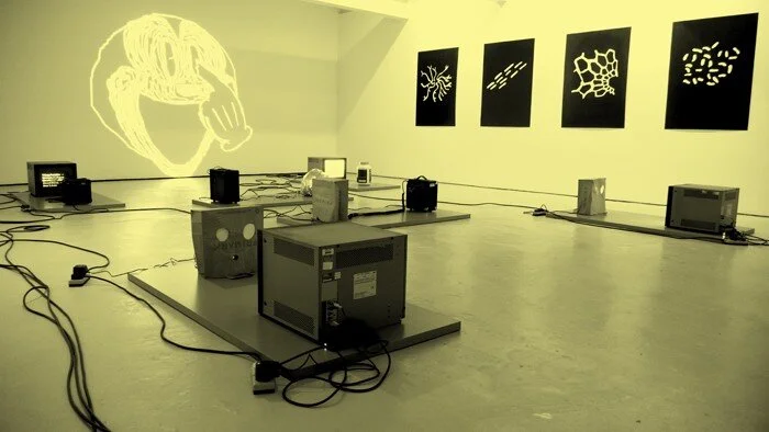 Glen Jamieson: For your installation THIS IS FEEDBACK at OUTPOST, the distinctions between the aural and visual become ambiguous - a monitor describes classical compositions that are watched by an amplifier sounding the image; dumb objects quiver and convulse with internal movement as they watch (some with eyes) the phenomenon of their own looping feedback on screen or through amplifier. Noise merges as an entirety - a strangely melodic progression. Can you comment on the presence of feedback within this complex installation?